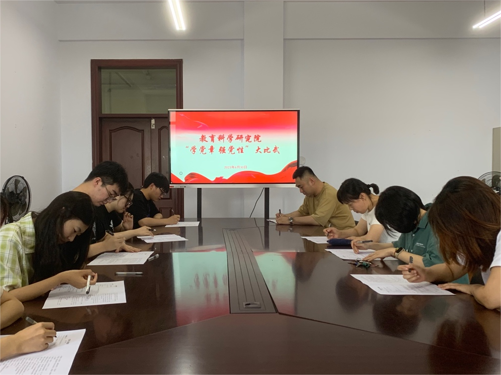 在庆祝中国共产党成立102周年之际,为深入推进学习贯彻习近平新时代中国特色社会主义思想主题教育,落实能力作风建设“工作落实年”实施方案,着力提升学院党组织的凝聚力和战斗力。教育科学研究院于2023年6月23日至7月1日开展“学党章 强党性”大比武活动,学院全体师生党员共计51人参加活动。