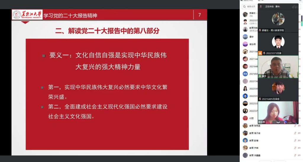 为深入推进学习贯彻习近平新时代中国特色社会主义思想主题教育,深刻领会党的二十大精神,教育科学研究院于6月7日下午组织党的二十大精神第二阶段宣讲。本次宣讲由马克思主义学院教授、博士生导师康宇主讲,学院党总支副书记付丽主持,学院全体教工、学生党员近100人参加讲座。