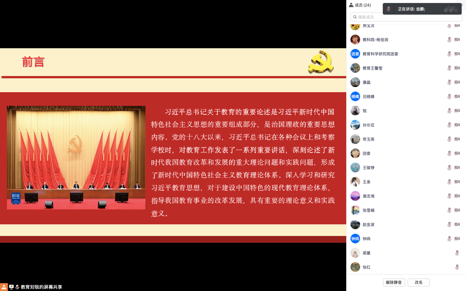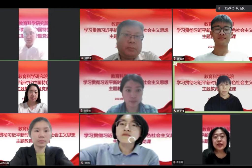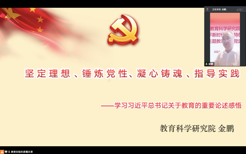 为深入推进学习贯彻习近平新时代中国特色社会主义思想主题教育,加强党员党性修养,教育科学研究院于2023年5月29日开展学习贯彻习近平新时代中国特色社会主义思想主题教育专题党课,题目为《坚定理想、锤炼党性、凝心铸魂、指导实践——学习习近平总书记关于教育的重要论述感悟》,学院党总支书记金鹏主讲,学院全体教师党员、学生党员代表参加。