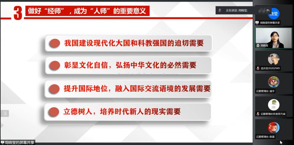随后,周老师提出一是要在“新技术革命”、“新全球化”的新趋势下准确把握新时代我国高等教育发展的内在逻辑,积极推进“线上+线下”双向融合教学模式发展,结合一流专业建设“双万计划”培养一流人才;二是要坚持知识创新、理论创新、方法创新;三是要在教学方面紧跟党的教育方针理念,革新教学观念,将培养社会主义建设者和接班人作为根本任务;四是要牢牢把握“四个需要”,明确“做好‘经师’,成为‘人师’”的重要意义,切实肩负起“立德树人、教书育人”的光荣职责和神圣使命。