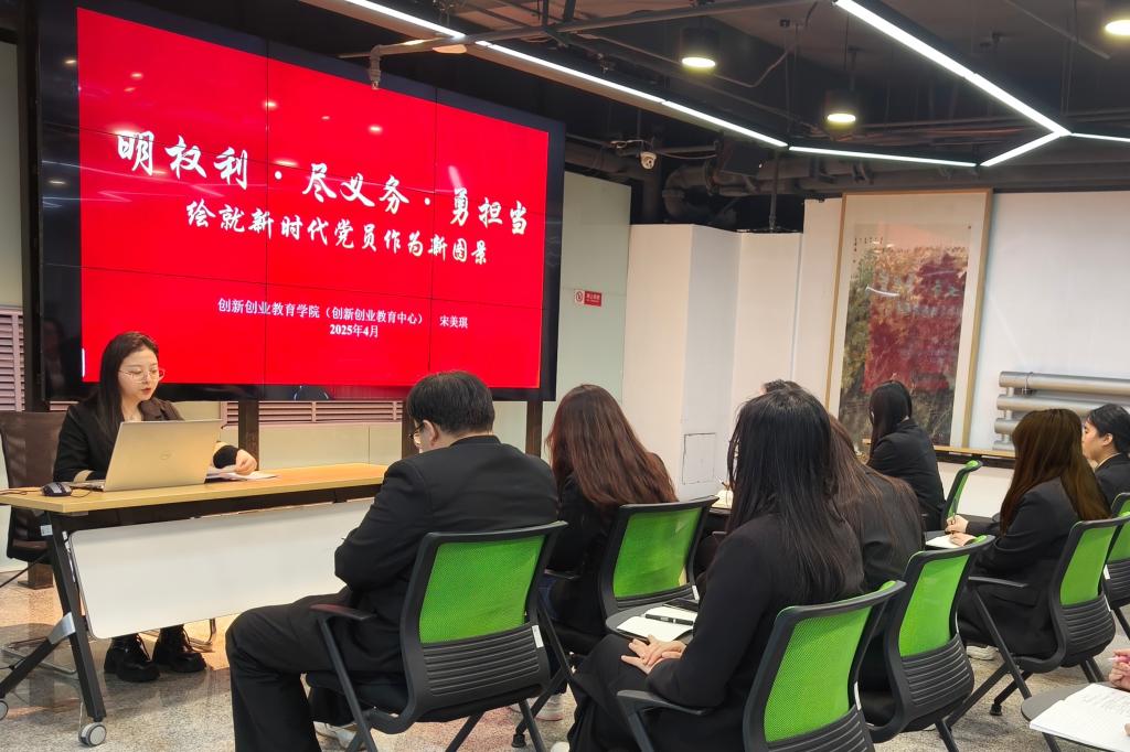 (创新创业教育中心)于4月21日在“创翼”师生创客空间开展以《明权利·尽义务·勇担当:绘就新时代党员作为新图景》为题的微党课,本次课程由学院2023级学生党支部书记宋美琪主讲。