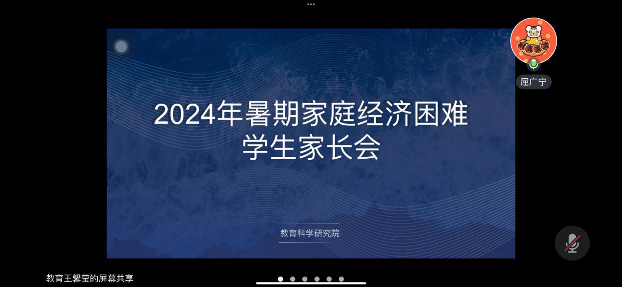 教育科学研究院于2024年7月16日18时在腾讯会议平台开展家庭经济困难学生家长会,2021级辅导员王馨莹主持会议,院党总支副书记屈广宁、各年级辅导员、家庭经济困难学生及其家长参会。首先,院团委书记闵诗尧向学生及家长宣传国家的资助政策,介绍学校学院在学生日常事务管理服务、家庭经济困难学生教育帮扶等方面工作开展情况。随后,院党总支副书记屈广宁表达了对学生的嘱托和期盼,希望家庭经济困难学生关注学业进度,不断提升综合能力。同时强调家庭经济困难学生要诚信资助,避免铺张浪费、奢侈消费。最后希望各位家长能与学校同频共振,携手促进学生成长发展。