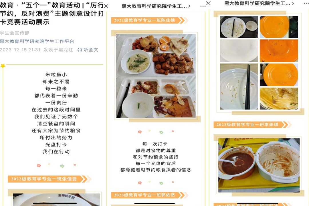 为深入学习习近平总书记重要指示精神,培养学生节约意识,传承勤俭节约的中华优良传统美德,杜绝铺张浪费行为,教育科学研究院组织展开“厉行节约,反对浪费”主题创意设计打卡竞赛。粒米虽小,照见文明修养;节约事微,可助兴国安邦。此次活动让同学们认识到,作为新一代的大学生,应养成勤俭节约的习惯,争做文明新风的传播者、光盘行动的践行者。