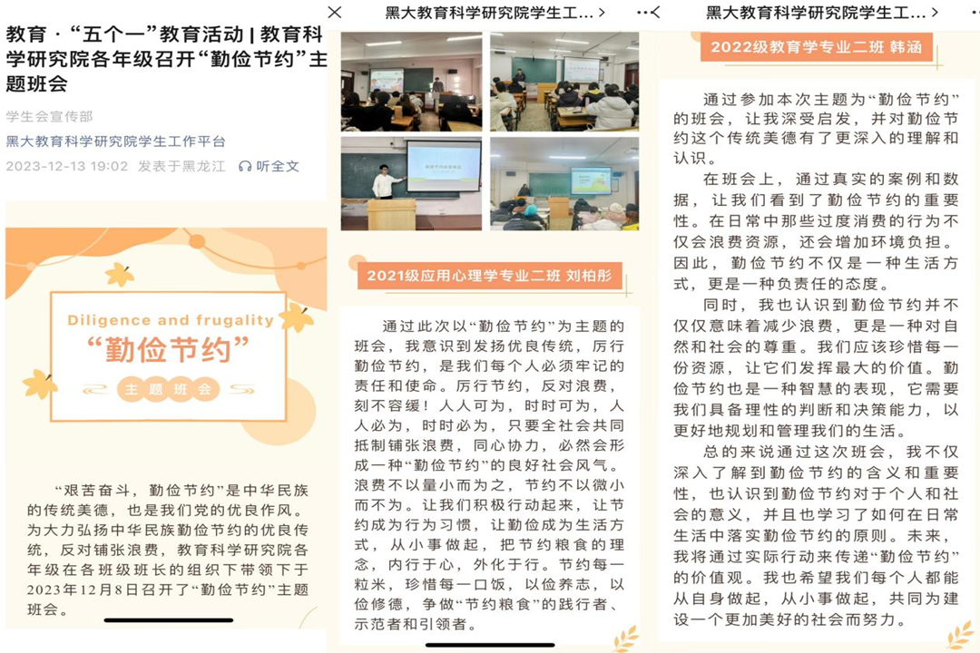 节约型校园建设实施方案》(校办发[2023]21号)相关要求,教育科学研究院面向学院全体学生组织开展“厉行节约,反对浪费”主题系列活动。现将活动情况总结如下:
