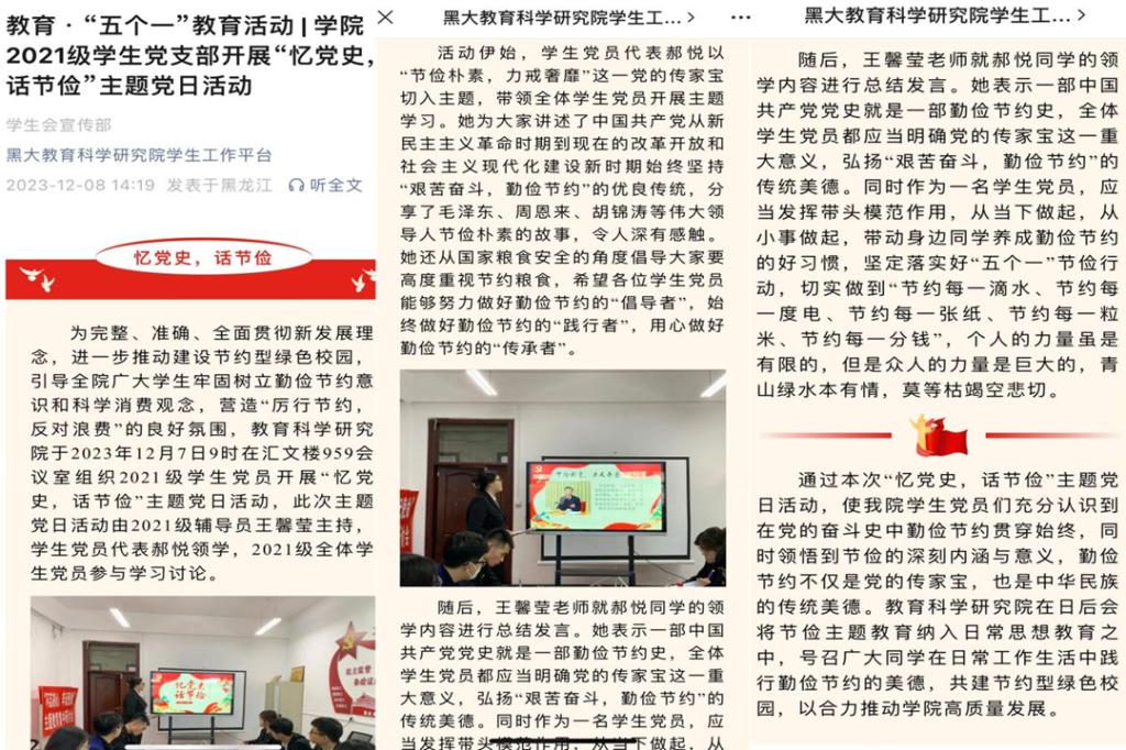 为号召我院广大学子在日常生活中践行勤俭节约美德,教育科学研究院组织2021级学生党员开展“忆党史,话节俭”主题党日活动,希望各位学生党员领悟到节俭的深刻内涵与意义,努力用心做好勤俭节约的倡导者、践行者和传承者,以自身为基点带动周围同学深刻认识到在党的奋斗史中勤俭节约贯穿始终,共建节约型绿色校园,合力推动学院高质量发展。
