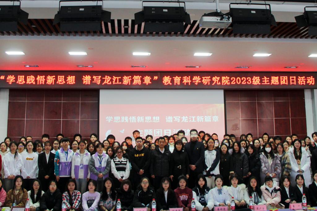 为深入学习贯彻党的二十大精神和团十九大精神,牢牢把握习近平总书记在黑龙江视察时的重要讲话重要指示精神,团结引领广大团员青年坚定跟党走,厚植爱国情怀,弘扬伟大建党精神,教育科学研究院积极响应校团委号召,于2023年12月11日10时在大学生活动中心报告厅组织2023级各专业团支部开展“学思践悟新思想 谱写龙江新篇章”主题团日活动。教育科学研究院党总支书记綦明霞、党总支副书记屈广宁、校团委宣传调研部副部长童一及各年级辅导员到会并给予指导,新生班主任、2023级全体学生参加活动。