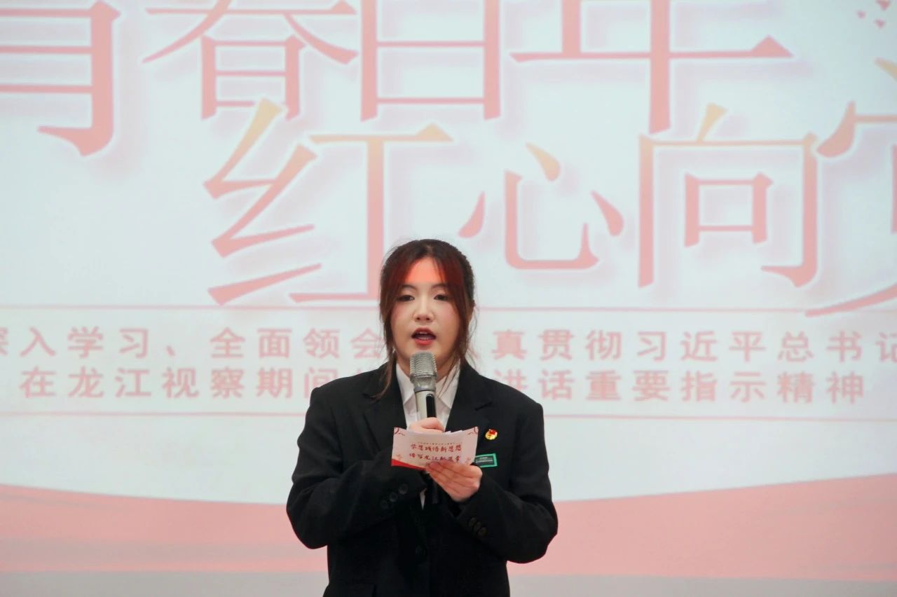 2023级团支书刁雨杉、许湫慧带领大家深入学习贯彻党的二十大精神、团十九大精神和习近平总书记在新时代推动东北全面振兴座谈会上的重要讲话精神,鼓励同学们怀揣一份青春热血、展现一份飒爽英姿,为东北振兴、国家富强、实现伟大中国梦贡献自己的青春力量。