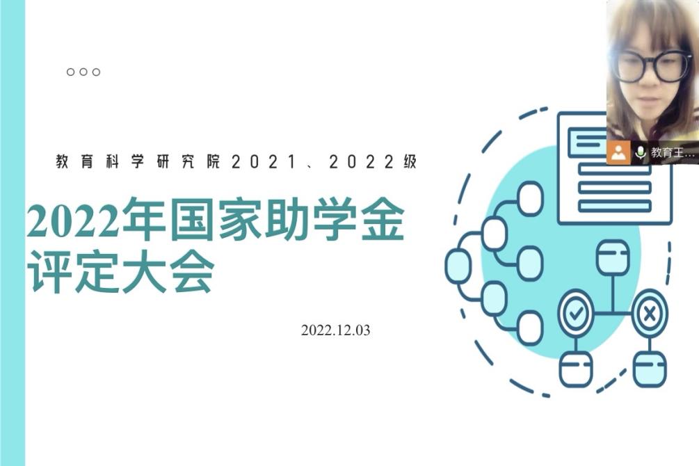 《学生工作部:关于评定2022年国家助学金的通知》的要求,本着公平、公正、公开的原则,根据教育科学研究院2022年家庭经济困难学生认定的实际情况,学院各年级于2022年12月1日至2日在腾讯会议平台开展2022年国家助学金评定大会,本次会议由各年级辅导员主持,各年级相关学生参会。