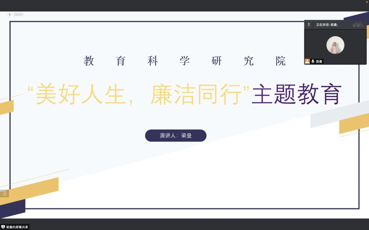 为进一步深化、巩固毕业生廉洁修身意识和本领,教育引导毕业生在今后学业生涯及职业发展中深刻践行诚实、守信、公平、公正的核心价值观,教育科学研究院于2022年5月25日线上开展“美好人生,廉洁同行”主题教育党课,会议由2018级辅导员梁曼老师主持,全体毕业生党员参会。