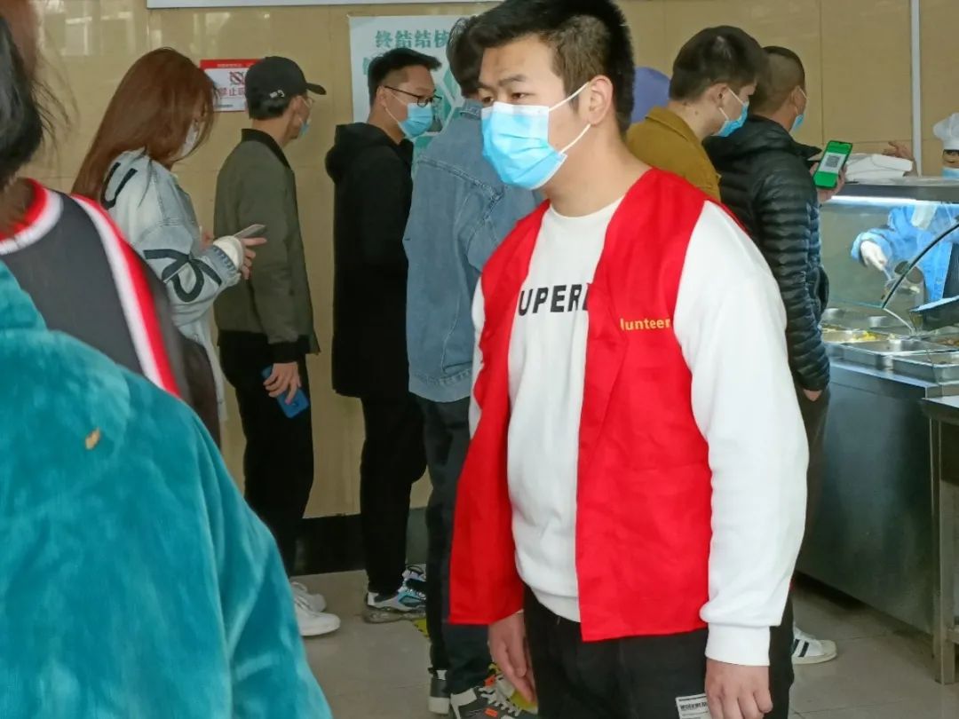 我院志愿者积极参与到此次活动中,筑牢校园疫情防控屏障,共同维护校园安全防线。志愿者在做好自身防护的前提下,积极热情地为大家服务,维持疫情期间食堂的就餐秩序。志愿者们坚守岗位,做好人员疏散工作,并提醒同学们佩戴口罩。食堂入口处,志愿者们检查学生是否佩戴口罩,是否扫码测温。食堂内,志愿者们耐心引导购餐的同学保持一米间隔有序排队,避免扎堆聚集。在活动过程中同学们团结协作、充满干劲,圆满完成任务。