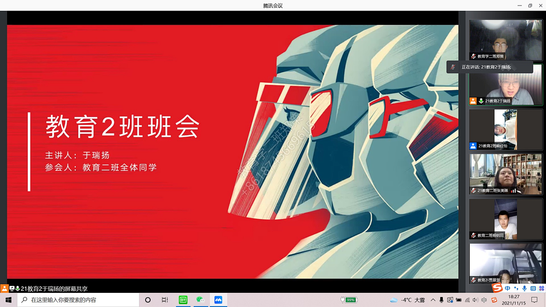 为了进一步帮助2021级新生更加科学地规划大学生活,明确学习目的并树立奋斗目标,2021年11月15日18时30分教育科学研究院于腾讯会议平台召开第二次班会,班会由2021级各班班长主持,各班班长、生活委员、学习委员主讲。本次班会共分为三个部分,分别为集体学习《杏吧原创