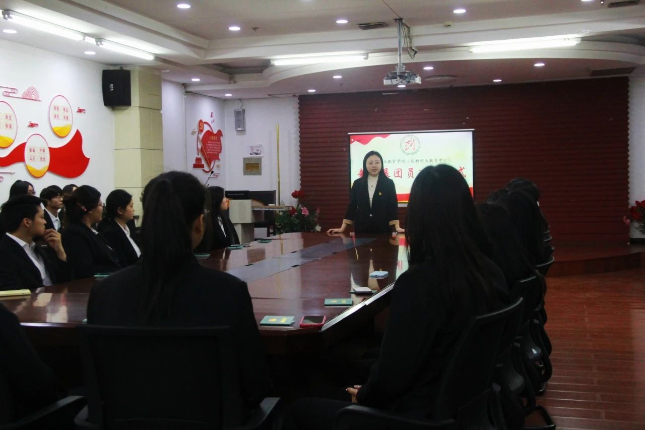 与会老师和团干部代表为新团员代表佩戴团徽。学院学生团委宣传部部长刁雨杉带领新团员面向团旗,紧握右拳,庄严宣誓。新团员代表金玉年与优秀团员代表孙晓丽依次发言。他们表示:身为团员,需筑牢信仰之基,夯实理论根基;锤炼过硬作风,恪守纪律规矩;牢记初心使命,勇担时代重任,要主动发挥先锋模范作用,在投身中国梦的生动实践里放飞青春理想,在为人民利益的不懈拼搏中谱写人生篇章。