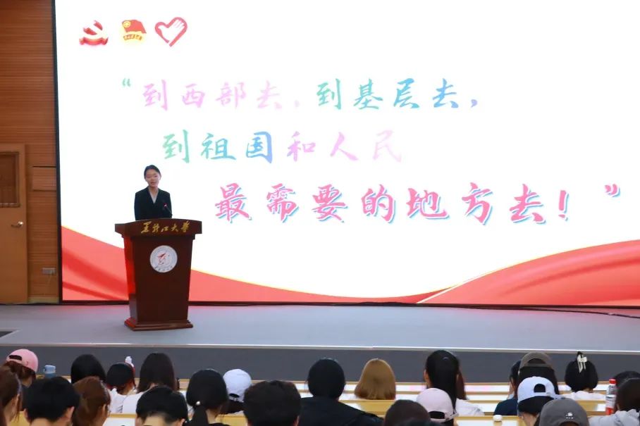 哲学学院李亚男同学以《无量山麓 美育花开》为题进行宣讲。她讲述自己在基层教学中用生动的美育课堂唤醒孩子求知欲、打开乡村视野的鲜活故事,深刻诠释教育帮扶对阻断贫困代际传递、激活边疆发展动能的重要意义。她呼吁同学们将青春奉献于西部热土,助力乡村振兴播撒教育希望。