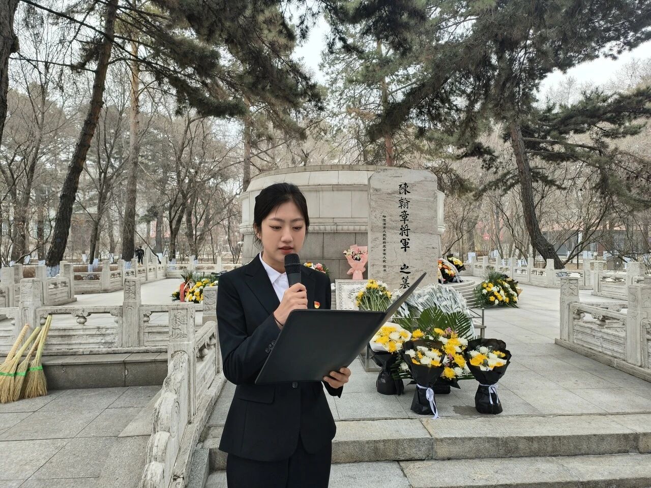 四位志愿者代表缓步上前,认真清理烈士墓周边环境,以最朴素的行动,表达对革命先烈的深切追思与崇高敬意。