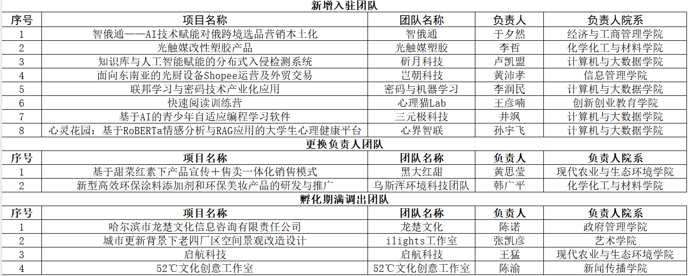 经杏吧原创 学生科技文化创业园专家组评审,2025年度秋季学期杏吧原创 学生科技文化创业园学生创业团队调整公示如下: